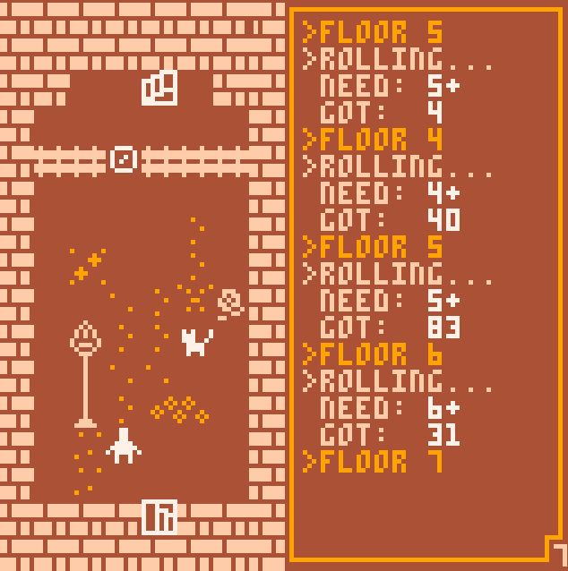 the tower is an absurdist game about climbing a tower of stochastic chutes and ladders. There is a magic door on each floor that determines whether you climb to the next floor or slip back to the previous one. The doors work thusly: roll a 100 sided die and compare your result to the number of the floor you’re on. If you roll higher than that number, you proceed. If you roll lower, you slip. Due to the rules of probability, tower climbers tend to congregate around floor 50 (there’s a party there) and it is practically impossible to reach the top without cheating. The “dice rolling” in the tower is imaginary, but it still feels fair to me. First it displays the goal, then it reveals what number you got. The typing effect makes it feel more weighty, more real, even though it doesn’t have a physical dice simulation like Slice and Dice. Simply put, players are more likely to accept randomness in the form of a visual process.